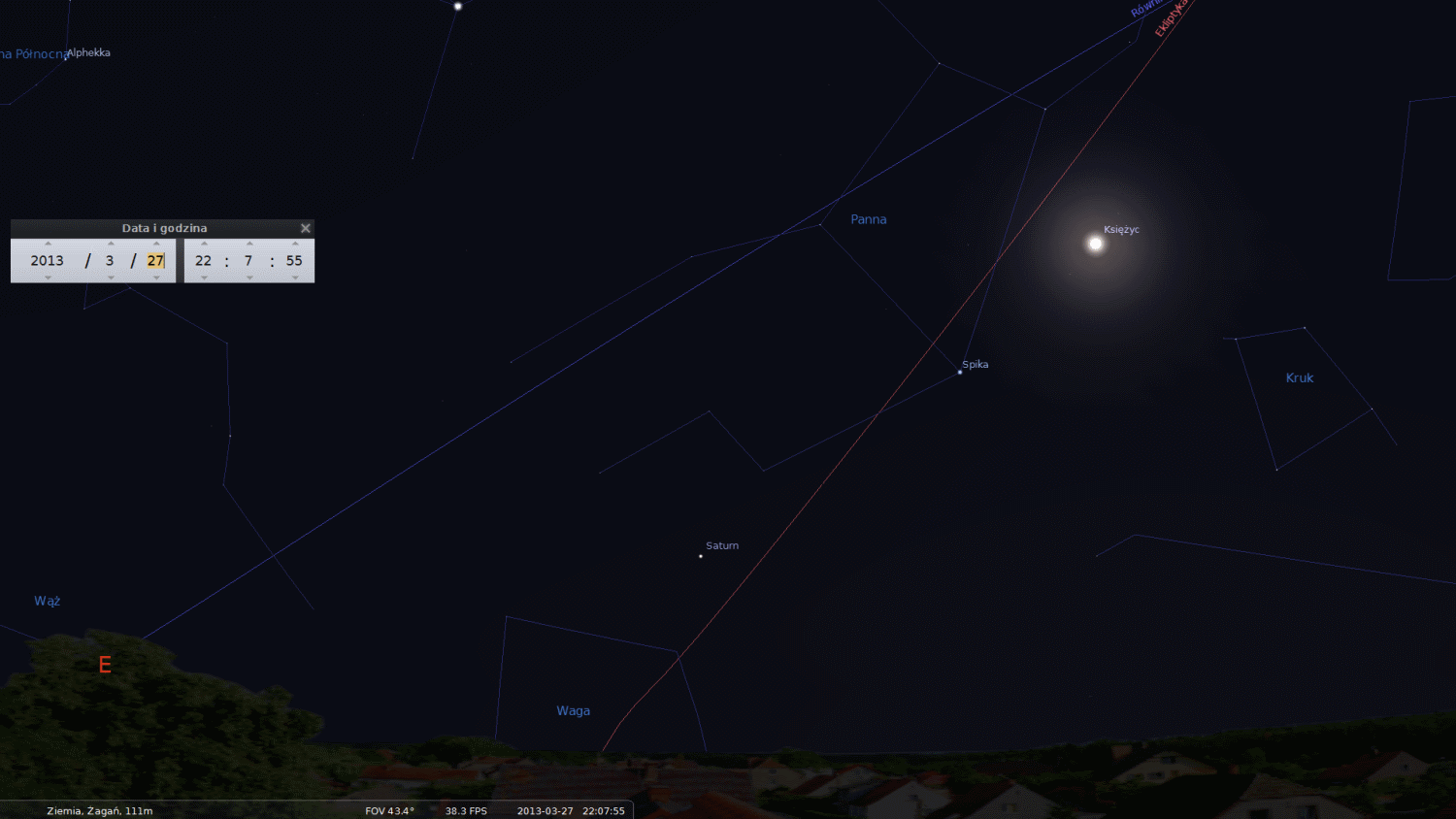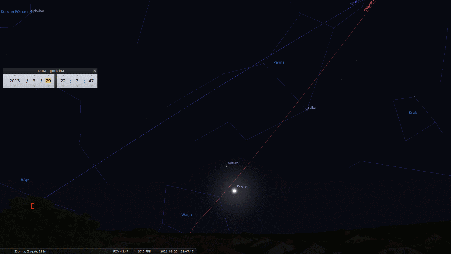 Spotkanie Spiscy Panny, Saturna i Księżyca w święta Wielkanocne 2013Około doby później dojdzie do kolejnej koniunkcji. "Księżyc i Saturn najbliżej siebie znajdą się o godzinie 19.13, ale ten czas jest także zbyt wczesny do obserwacji. W tym przypadku musimy poczekać do okolic godziny 23, kiedy to Srebrny Glob i planeta z pierścieniami będą świecić około 15 stopni nad południowo-wschodnim horyzontem. Dystans je dzielący w tym momencie wyniesie 4,5 stopnia" - zapowiedział dr Olech.
