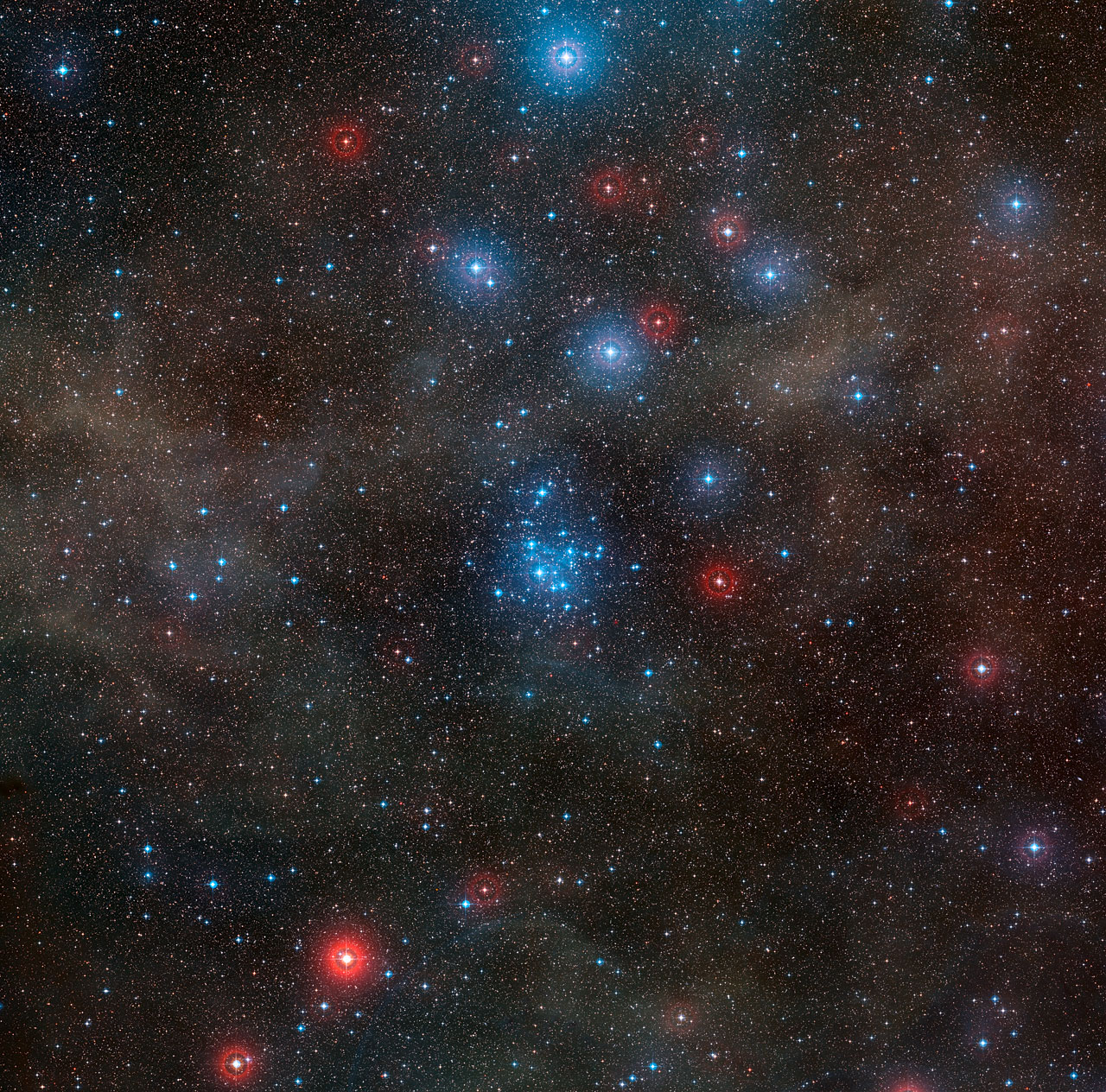 Te ładnie świecące na niebiesko gwiazdy to gromada NGC 2547, grupa niedawno powstałych gwiazd w południowym gwiazdozbiorze Żagla. Zdjęcie wykonano za pomocą instrumentu Wide Field Imager na 2,2-metrowym teleskopie MPG/ESO w Obserwatorium ESO La Silla w Chile.