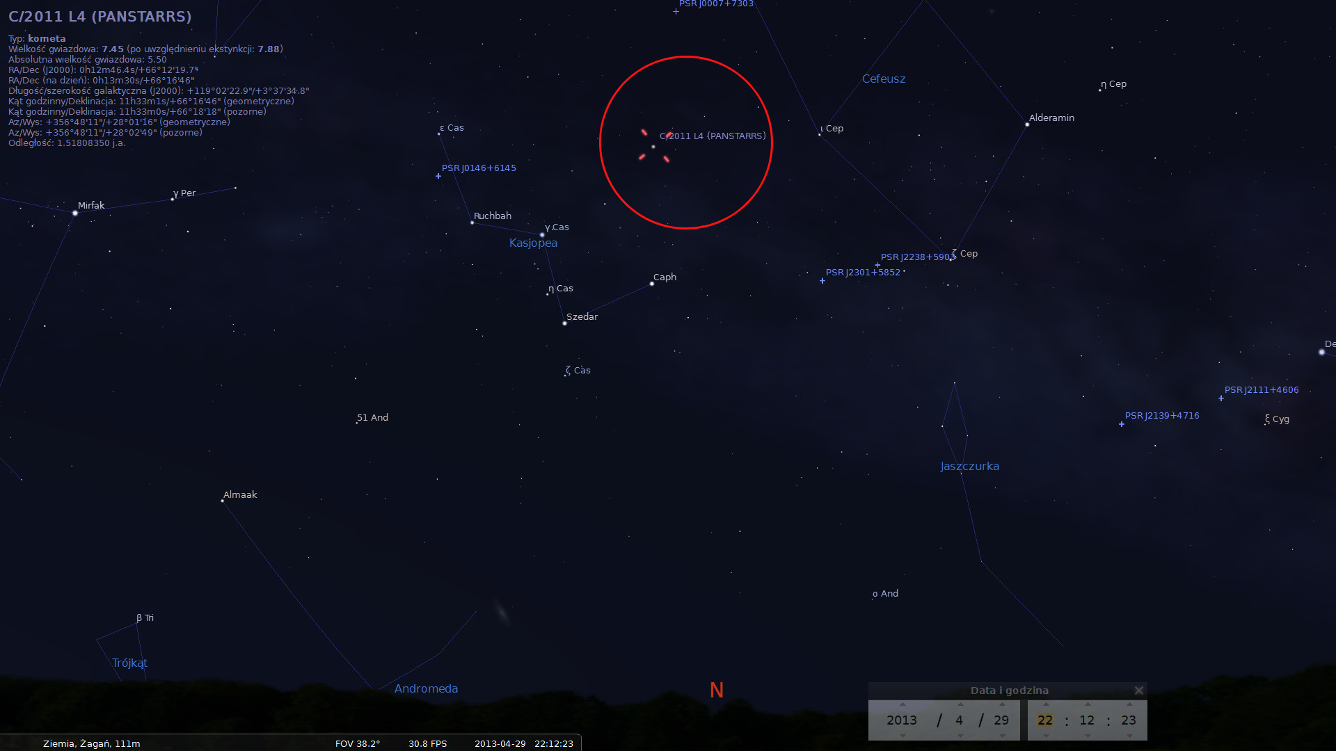 Położenie komety PanStarrs ostatniego dnia kwietnia, choć bardzo wysko na niebie, będzie już niezwykle słabym obiektem.Przez cały kwiecień będzie można obserwować jasną kometę C/2011 L4 (PanSTARRS), która przemieści się z konstelacji Andromedy do Kasjopei. Będzie widoczna wieczorem, na początku miesiąca nawet gołym okiem, a pod jego koniec przez lornetkę.