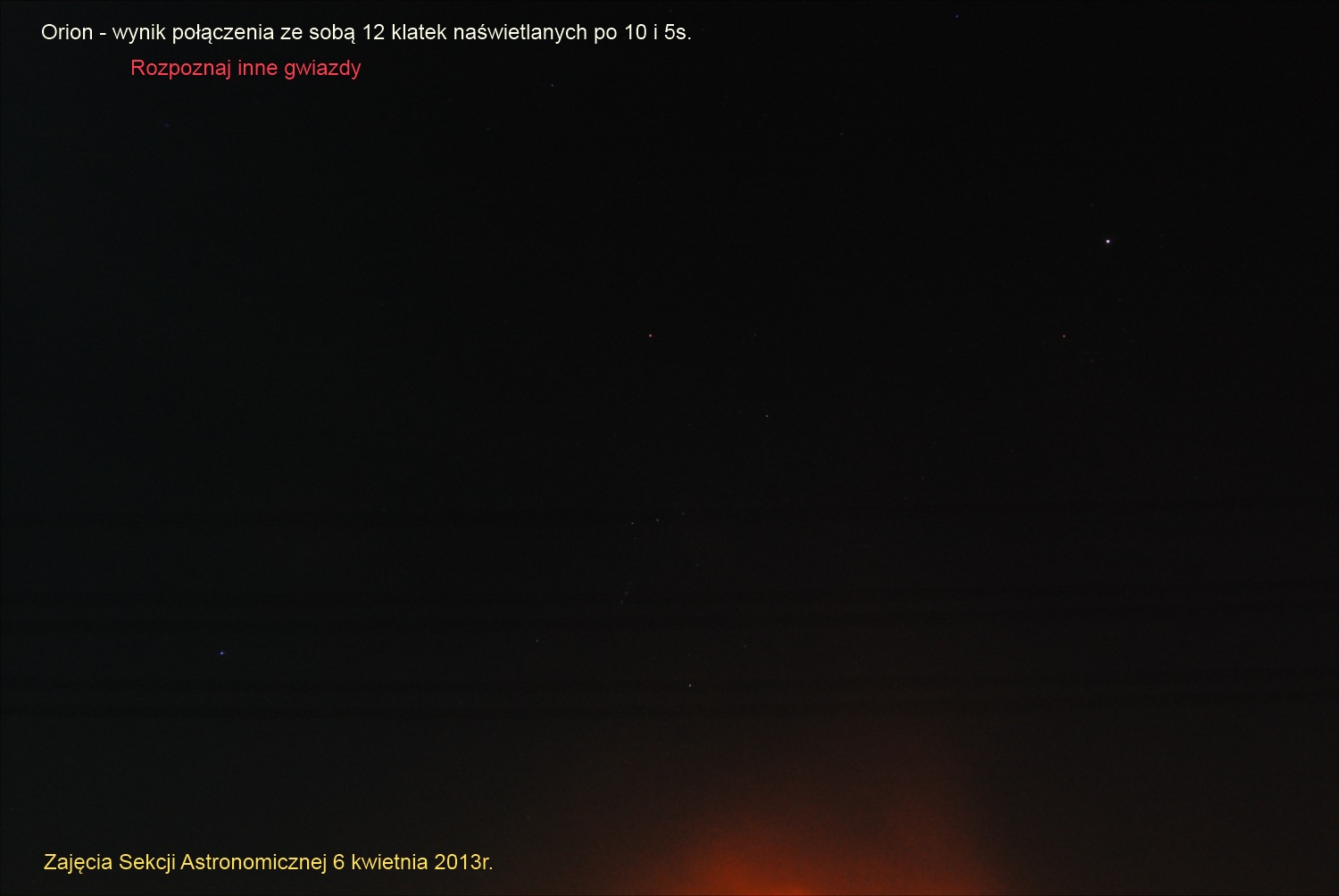 Orion połączone 12 klatek zdjęć wykonanych po 10 i 5 sekund. Rozpoznaj resztę widocznych gwiazdW ramach tych zajęć mieliśmy okazję poznać podstawowe założenie tzw. procesu redukcji zdjęć (obrazów cyfrowych;