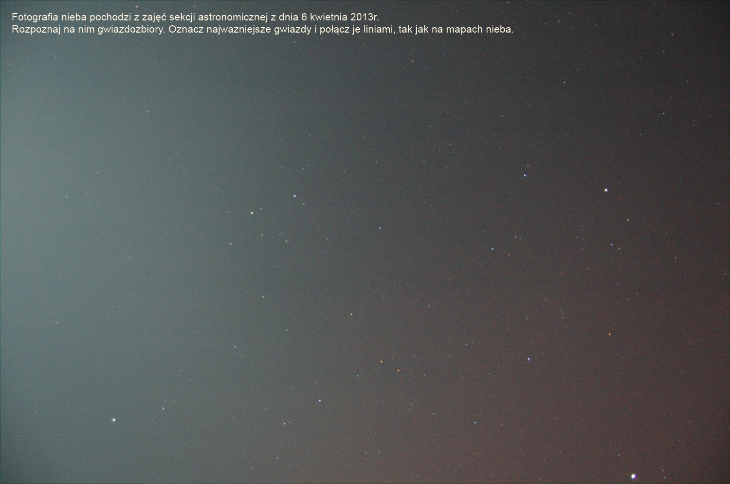 My też zajęliśmy się jednym z takich zagadnień, dzięki temu, że pewien wieczór pozwolił na wykonanie prostych zdjęć nocnego nieba nieruchomym aparatem. Przy okazji można było się przekonać jak wiele na naszym niebie jest …. sztucznego światła miasta.