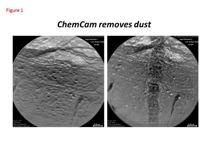 Przemieszczany przez wiatr pył został przebadany przez instrument łazika o nazwie ChemCam (Chemistry and Camera). Za pomocą będącego na wyposażeniu tego instrumentu lasera „zdejmowano” wierzchnią warstwę pyłu ze skały i badano skład wewnętrzny. Badacze wiedzieli, iż Mars jest czerwony z uwagi na tlenek żelaza w pyle, jednak ChemCam ujawnił bardziej jego złożoną kompozycję chemiczną. Okazało się, że skały zawierają też ślady wodoru, który może być zawarty w formie hydroksylowej lub cząsteczek wody. Potencjalny proces wymiany cząsteczek wody pomiędzy atmosferą i powierzchnią Marsa badany jest m.in. za pomocą instrumentu DAN (Dynamic Albedo Neutrons), dostarczonego przez Rosjan. Drugie zdjęcie w galerii tego artykułu obrazuje działanie lasera instrumentu ChemCam.
