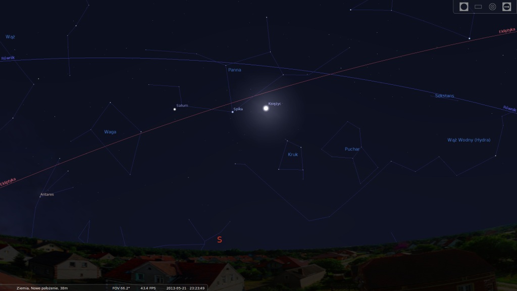 Z obserwacjami najlepiej poczekać więc do godziny 22:00-22:30. O tej porze Spica oraz Księżyc górują i widać je niespełna 25 stopni nad południowym horyzontem. Tak się składa, że Księżyc będzie wtedy świecił prawie dokładnie w połowie drogi pomiędzy Saturnem a Spiką.