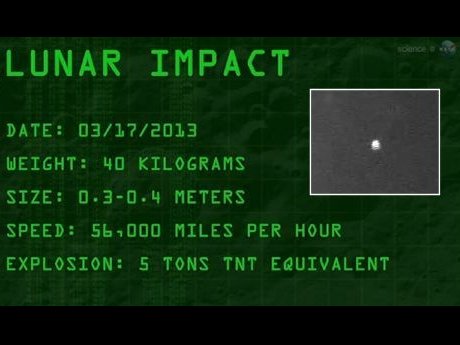 Od czasu do czasu obserwuje się uderzenia małych obiektów w Księżyc – głównie podczas przelotu przez rój meteorów. Siedemnastego marca tego roku doszło do najsilniejszego z dotychczas zarejestrowanych uderzeń w Srebrny Glob. Obiekt wielkości „małego głazu” uderzył w obszar Księżyca zwany „Morzem Deszczów”. Masę tego obiektu ocenia się na około 40 kilogramów a średnicę na 30-40 cm. Uderzenie było tak silne, że można by je zaobserwować gołym okiem z Ziemi.