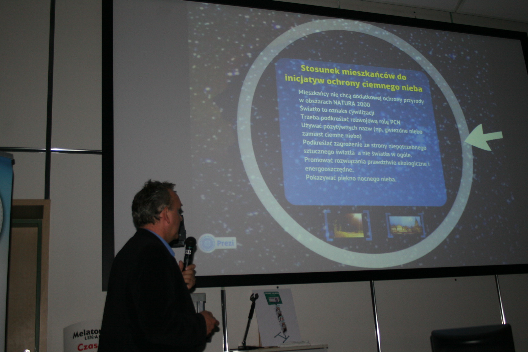 II blok prezentacji poświęcony był wpływom zanieczyszczenia sztucznym światłem na organizmy żywe- człowieka, zwierzęta i rośliny. Pani prof. dr hab. Krystyna Skwarło-Sońta (Uniwersytet Warszawski) szczególnie zaciekawiła wszystkich uczestników prezentacją na temat funkcjonowanie zegara biologicznego człowieka w warunkach skażenia światłem