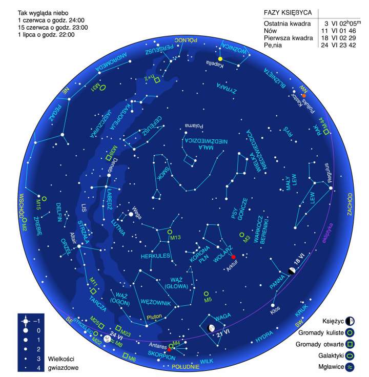 Niebo w wybranych dniach czerwcaZapowiedział, że 12 czerwca o godz. 18.43 Merkury znajdzie się w maksymalnej elongacji wschodniej (czyli w maksymalnej odległości kątowej od Słońca). To stworzy dobre warunki do obserwacji tej planety, które utrzymają się przez pierwszą połowę czerwca.