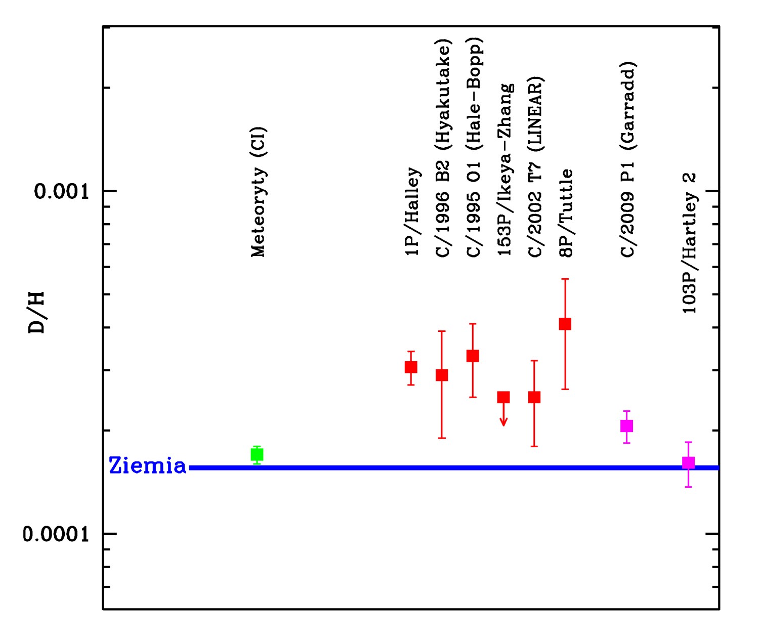 Stosunek deuteru do wodoru ( D/H) w wodzie kometarnej w porównaniu do węglistych meteorytów (z zewnętrznego obszaru Pasa Głównego Planetoid) oraz wody w ziemskich oceanach (źródło - opracowanie S. Szutowicz w oparciu o Balsiger H.,et al. 1995, Bockelée-Morvan D. et al.1998, Meier R. et al. 1998, Biver N. et al. 2006, Hutsémekers D,et al. 2008, Villanueva G. et al. 2009, Hartogh P. et al. 2011, Bockelée-Morvan D. et al. 2012, Robert F. 2006, De Laeter J.R. et al.2000).Kometa C/2009 P1 Garradd jest kometą długookresową i badacze często zaliczają ją do grupy komet pochodzących z tzw. Obłoku Oorta, które zgodnie z obowiązującymi poglądami uformowały się w zaraniu istnienia Układu Słonecznego, w pobliżu dużych planet gazowych – Jowisza, Saturna, Urana i Neptuna. Natomiast krótkookresowa kometa 103P/Hartley 2 należy do populacji komet, które powstawały w bardziej zewnętrznych częściach Układu Słonecznego, najpewniej dalej niż orbita Urana (pierwsza grafika w galerii tego artykułu).