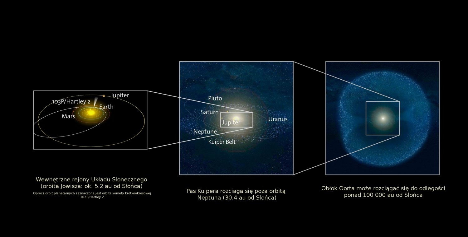 Położenie Pasa Kuipera (środkowy panel na rysunku) oraz hipotetycznego Obłoku Oorta (prawy panel) w naszym Układzie Słonecznym. Dziś uważa się, że są to dwa współczesne źródła wszystkich komet pojawiających się w wewnętrznych obszarach Układu Słonecznego (lewy panel). Symulacje dynamiczne wskazują, że komety krótkookresowe (takie jak 103P/Hartley 2) pochodzą z Pasa Kuipera, zaś komety długookresowe z Obłoku Oorta. Wiemy, że obiekty w Pasie Kuipera poruszają się po orbitach zwykle niewiele nachylonych do płaszczyzny ekliptyki i podobnie poruszają się komety krótkookresowe. Ponieważ komety długookresowe poruszają się po orbitach dowolnie nachylonych do płaszczyzny ekliptyki, dlatego postuluje się, że Obłok Oorta jest sferycznie symetryczną chmurą obiektów skalno-lodowych (źródło: UK Space Agency www.bis.gov.uk/ukspaceagency/news-and-events/ i M. Królikowska-Sołtan).Teleskop Kosmiczny Herschel przez ostatnie cztery lata badał chłodne obiekty Wszechświata, w tym komety w zakresie mikrofalowym umożliwiającym między innymi dokonanie ocen proporcji deuteru do wodoru obecnych w tych obiektach. Uzyskane proporcje dla komet mocno zachwiały naszymi dotychczasowymi przekonaniami o miejscach powstania i ewolucji dynamicznej tych ciał.