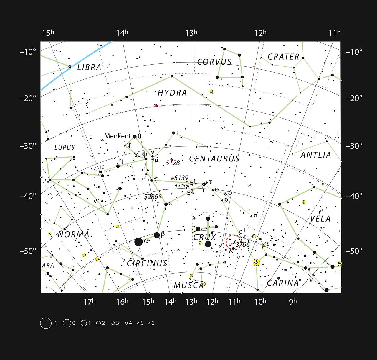 [1] Opisana gromada gwiazd jest jedną z kilku objętych programem badawczym NGC 3766 znajduje się około 700 lat świetlnych od Ziemi, a naniesie widać ją w południowym gwiazdozbiorzez Centaura. Szacuje się, że ma 20 milionów lat.
