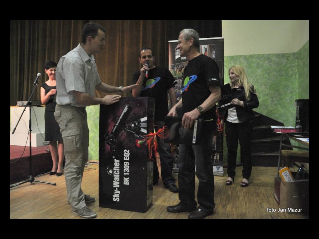 Wręczenie nagrody ufundowanej przez Planetę Oczu dla naszego StefanaPomału kończymy rok szkolny w Szkole Talentów. Co nie kończy badań nieba, bo te nie znają wakacji. Wolny czas to doskonała okazja do zaplanowania i realizacji wszystkich zaległych obserwacji, jeśli tylko pogoda dopisze naszym planom. W końcówce tego szkolnego roku przyszedł czas na małe podsumowanie pracy całego zespołu i wszystkich sekcji Szkoły Talentów w naszym Centrum Kultury.