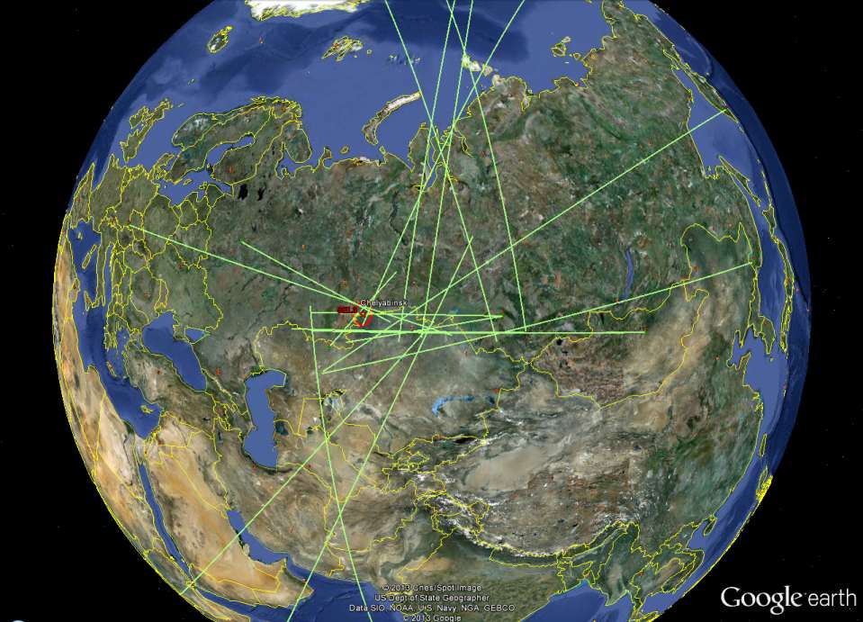 Falę uderzeniową meteorytu czelabińskiego odnotowało 20 stacji CTBTO / Credits: CTBTO, Google MapsNa dnie jeziora Czebarkul może znajdować się nawet 300 kilogramowy fragment meteorytu czelabińskiego. Opublikowano też raport z obserwacji fali uderzeniowej meteorytu.