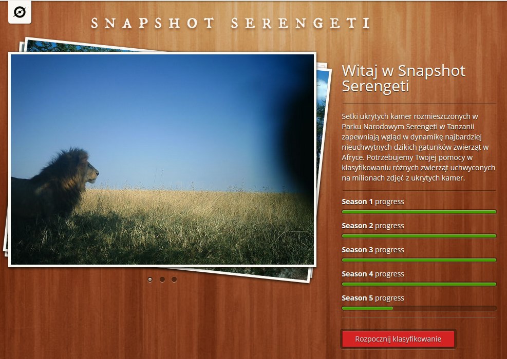 Snapshot Serengeti. Celem jest analiza obrazów zrobionych przez liczne kamery umieszczone na terenie rezerwatu Serengeti. Kamery są w pełni automatyczne i kiedy wykryją ruch robią sekwencję zdjęć. Reszta należy do nas. Trzeba rozpoznać zwierzę ze zdjęcia i odpowiednio je sklasyfikować. Ustalić czy akurat żeruje, odpoczywa a może po prostu idzie lub bawi się z innymi osobnikami. Z początku może wydać się to mało związane z astronomią, ale z nauką na pewno. Kamery nie zawsze są wycelowane w optymalny sposób, więc czasem na fotografii mamy tylko zad antylopy albo ruszającą się trawę. Jest okazja poznać jak niezwykle bogaty w ssaki jest to rejon świata. I być może zrozumiemy dlaczego warto je chronić.