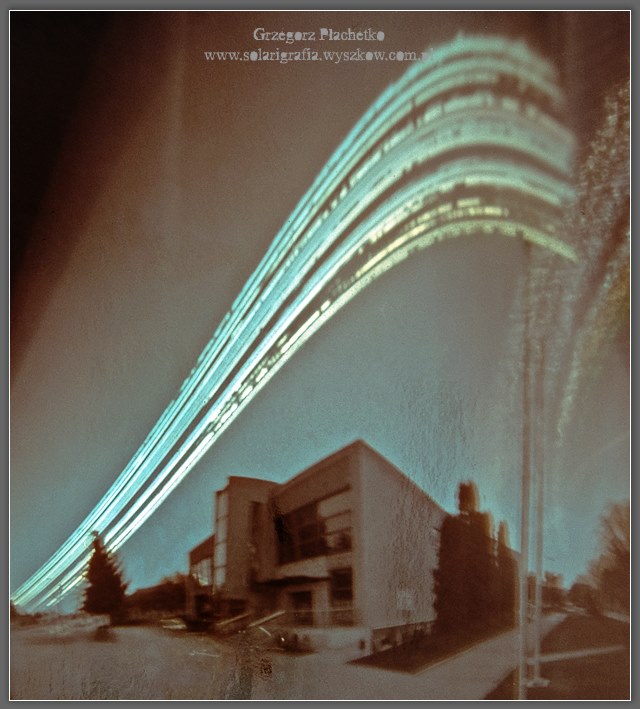 Solarigrafia. Wyszkowski Ośrodek Kultury HUTNIK. Bardzo krótkie, testowe naświetlanie. Data umieszczenia aparatu: 24.04.2013 r. Data zdjęcia aparatu: 06.06.2013 r. Materiał: Kodak Kodabrome IIRCOstatnie spotkanie przed wakacjami członków sekcji astronomicznej w nieco skromniejszym gronie wyposażyło nas wszystkich w przydatną umiejętność wyboru ciekawego sposobu spędzania tego wolnego czasu. Dlaczego związaliśmy je z celownikiem? No cóż, to już nieco dłuższa historia.