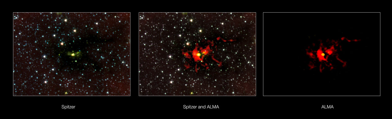 Najmasywniejsze i najjaśniejsze gwiazdy w galaktyce powstają w chłodnych i ciemnych obłokach, ale procesy te pozostają ukryte w pyle i ciągle stanowią zagadkę [1]. Międzynarodowy zespół astronomów wykorzystał ALMA do wykonania mikrofalowego skanu prenatalnego, aby uzyskać lepszy wgląd w powstawanie jednej z monstrualnych gwiazd, która znajduje się 11 000 lat świetlnych od nas w obłoku znanym jako Spitzer Dark Cloud (SDC) 335.579-0.292.