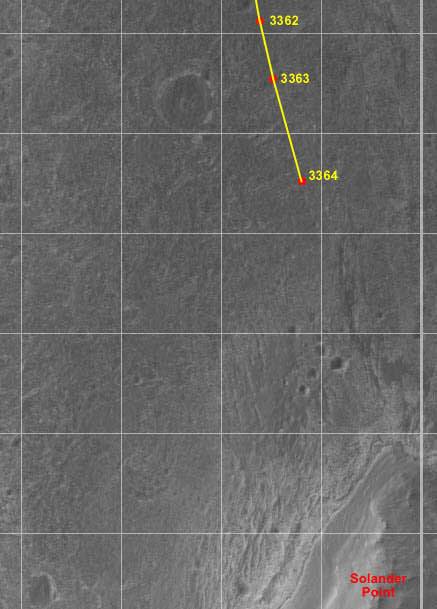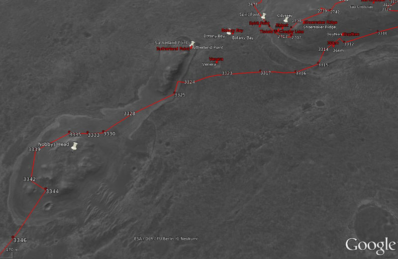 Położenie Opportunity podczas Sol-3364 (NASA/JPL/P.Stooke/E.Tesheiner)Łazik ruszył w kierunku południowym wzdłuż wschodniej części Cape York. Po opuszczeniu tej formacji, został skierowany w kierunku południowo-zachodnim w stronę niewielkiego wzniesienia Sutherland Point. Tam pojazd skierował się na południe i dojechał do pobliskiej formacji Nobbys Head, którą w czerwcu minął od strony zachodniej. Dalej do przebycia pozostał już tylko kilometrowy odcinek prowadzący prosto w stronę północnych zboczy Solander Point. Kolejne przejazdy, niektóre przekraczające nawet 100 m, szybko zmniejszały dystans do celu podróży. Na początku lipca Opportunity znalazł się w połowie drogi pomiędzy Nobbys Head a Solander Point.