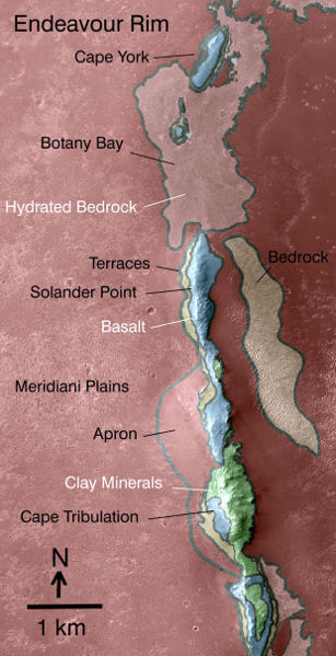 Mapa minerałów występująca w pobliżu krateru Endeavour. Uwagę zwraca silna koncentracja minerałów ilastych na wzgórzu Cape Tribulation (NASA/JPL)Po dotarciu do wzniesienia Solander Point, jego zbocza mają zostać wykorzystane podczas najbliższej zimy, umożliwiając optymalne ustawienie paneli słonecznych. Po jej zakończeniu nastąpią dalsze badania Solander Point, a w przyszłości niewykluczone są badania kolejnych wzgórz w tym "świętego Grala" tej misji - wzgórza Cape Tribulation. Tam spektrometr CRISM sondy MRO zarejestrował silną koncentrację minerałów ilastych, które podobnie jak skała Esperance jest śladem po przeszłym wodnym środowisku o neutralnym pH.