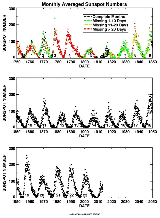 Wykresy aktywności słonecznej w latach 1750-2013 (częściowo rekonstrukcja) według Hathaway / NASA.Słońce znajduje się obecnie w szczycie 11-letniego cyklu swej aktywności. Jednak liczba plam i intensywność wybuchów świadczy o tym, że tak spokojne nie było w tym okresie od ponad 100 lat.