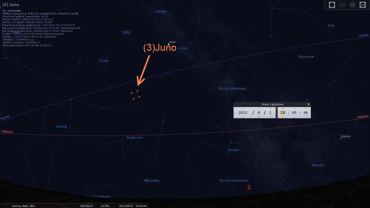 Położenie planetoidy Juno na początku sierpnia 2013W sierpniu w opozycji znajdą się dwie duże planetoidy: Juno i Iris. Obie będzie można obserwować przez lornetkę - poinformował PAP dr hab. Arkadiusz Olech z Centrum Astronomicznego PAN.