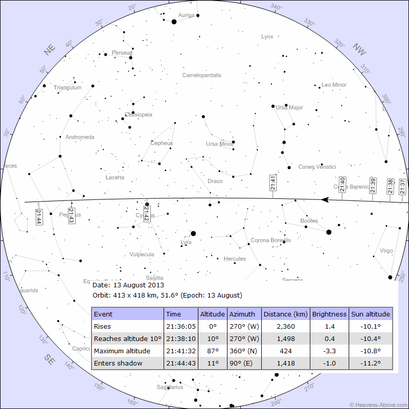 ISS nad Żaganiem 13 sieprnia 2013r.ISS zagości trzy razy w nadchodzącą noc, ale tylko 1 raz będzie to bardzo widowiskowe i widoczne dla każdego. Załączona mapka pomoże przygotować się do obserwacji. Również dzisiaj możemy nadal obserwować Rój Perseid. Nie będzie może on tak liczny jak wczoraj, co tez nie jest do końca takie pewne, ale piękna mu nie będzie brakowało.