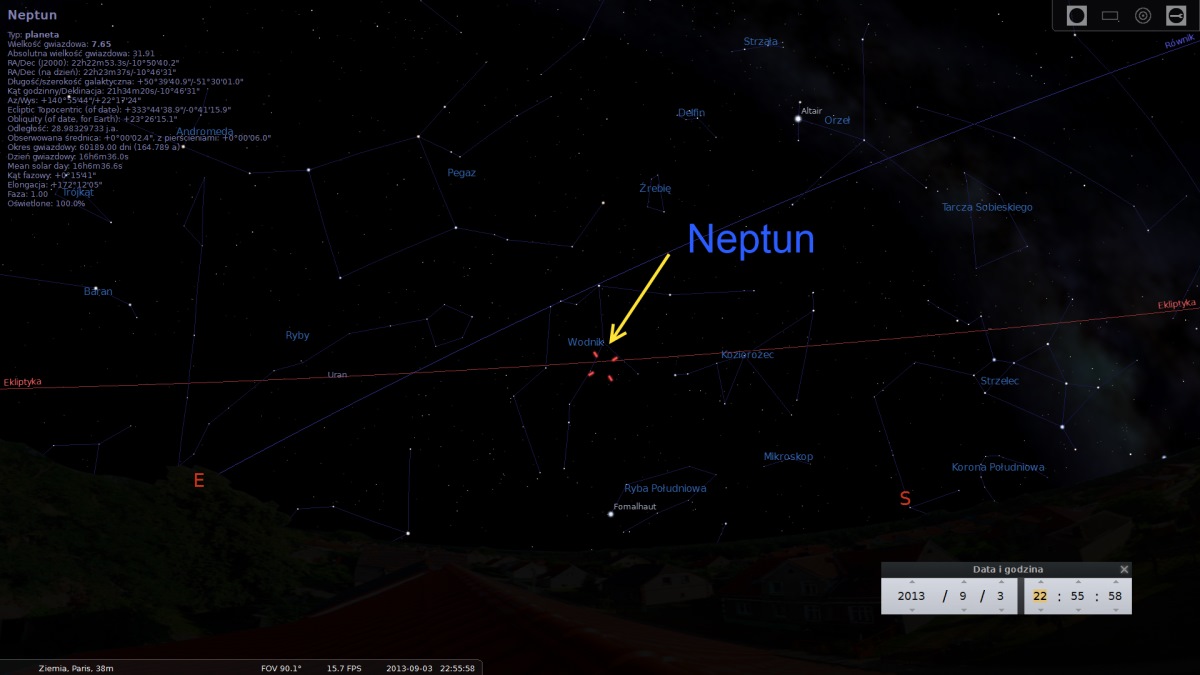 Urana Neptun miał swoją opozycję pod koniec sierpnia, przez co wrzesień także świetnie nadaje się do jego obserwacji. "Blask planety sięga obecnie 7.8 magnitudo, a to oznacza, że dojrzymy go przez nawet mała lornetkę. Neptun znajduje się w konstelacji Wodnika i przed północą świeci niespełna 30 stopni nad południowym horyzontem" - powiedział.