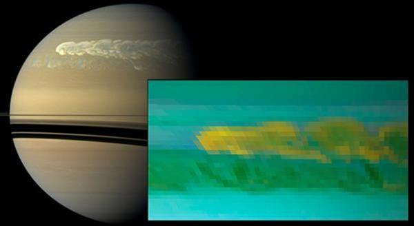 Saturn sfotografowany 25.02.2011 r. przez sondę Cassini. Po lewej zdjęcie w zakresie widzialnym, a po prawej burza w atmosferze widziana dzień wcześniej na falach podczerwonych. Źródło: NASA/JPL-Caltech/SSI/Univ. of Arizona/Univ. of Wisconsin. Wielka burza na Saturnie umożliwiła sondzie Cassini wykrycie lodu wodnego pochodzącego z wnętrza saturniańskiej atmosfery, który trafił do jej górnych warstw dzięki zaburzeniom spowodowanym przez potężny huragan – informuje NASA.