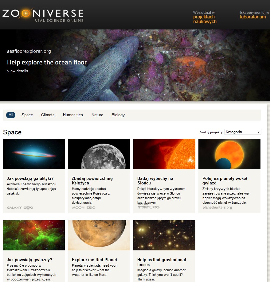 Strona Zooniverse - stąd trafisz do wszystkich projektów Rozpoznawanie pieśni waleni czy odgłosów nietoperzy, szukanie określonych galaktyk czy nawet lwa na sawannie - to zadania badawcze, które może wykonywać każdy internauta. O nauce obywatelskiej opowiadał w Warszawie jeden z twórców portalu Zooniverse, dr Robert Simpson.