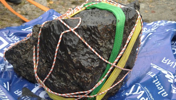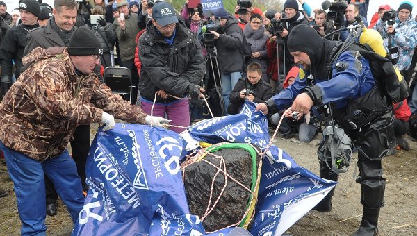 Największy do tej pory znaleziony fragment meteorytu z 15 lutego / Credits: RIA NowostiWydobyty z dna jeziora fragment ważył około 600 kilogramów. Niestety, podczas operacji podnoszenia pękł na trzy części. Dokładna waga nie jest znana, gdyż w użytej na miejscu wadze skala skończyła się na 570 kilogramach. Po dokładnym zbadaniu największy fragment zostanie wystawiony do oglądania w lokalnym muzeum.