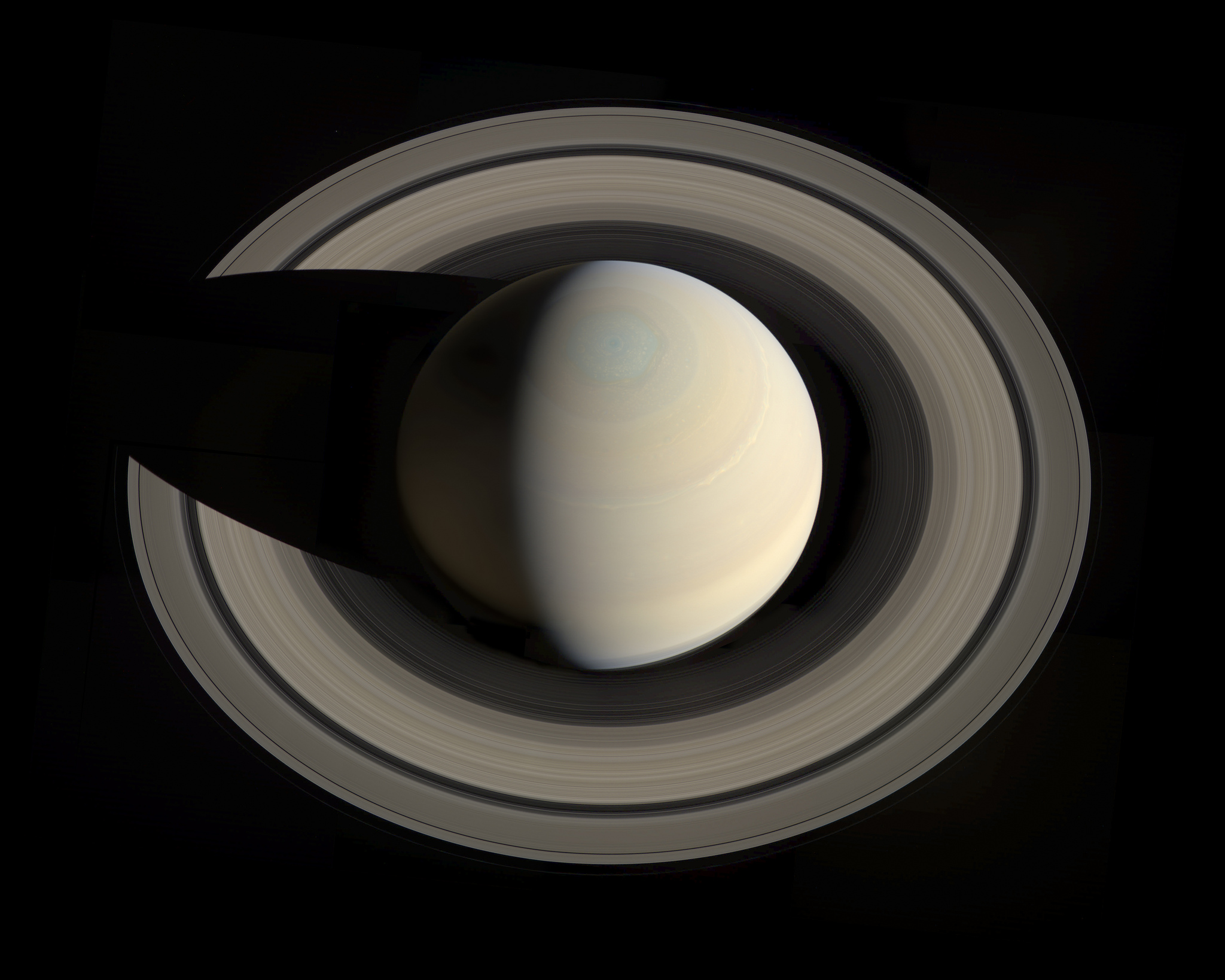 Na mozaice widać także pierścienie Saturna, które wyraźnie się różnią od siebie i które składają się z niezliczonej ilości mniejszych pasów pierścieni. Pomiędzy pierścieniami można zauważyć kilka przerw, z których największa nosi nazwę przerwy Cassini'ego. Najnowsze wyniki badań, oparte w dużej części na danych uzyskanych przez sondę Cassini sugerują, że pierścienie Saturna są prawie tak stare jak Układ Słoneczny. Ich wiek szacuje się na około 4 miliardy lat.