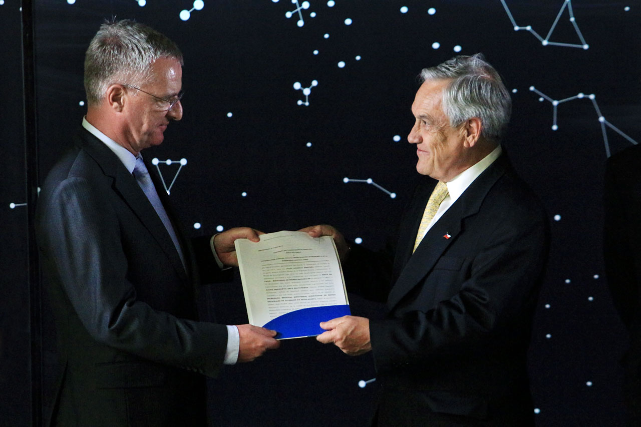 Podczas uroczystości w Rezydencji Paranal Prezydent Piñera wręczył Dyrektorowi Generalnemu ESO niedawno podpisaną zgodę na przekazanie terenu wokół Cerro Armazones.