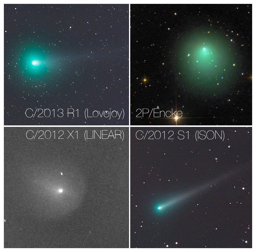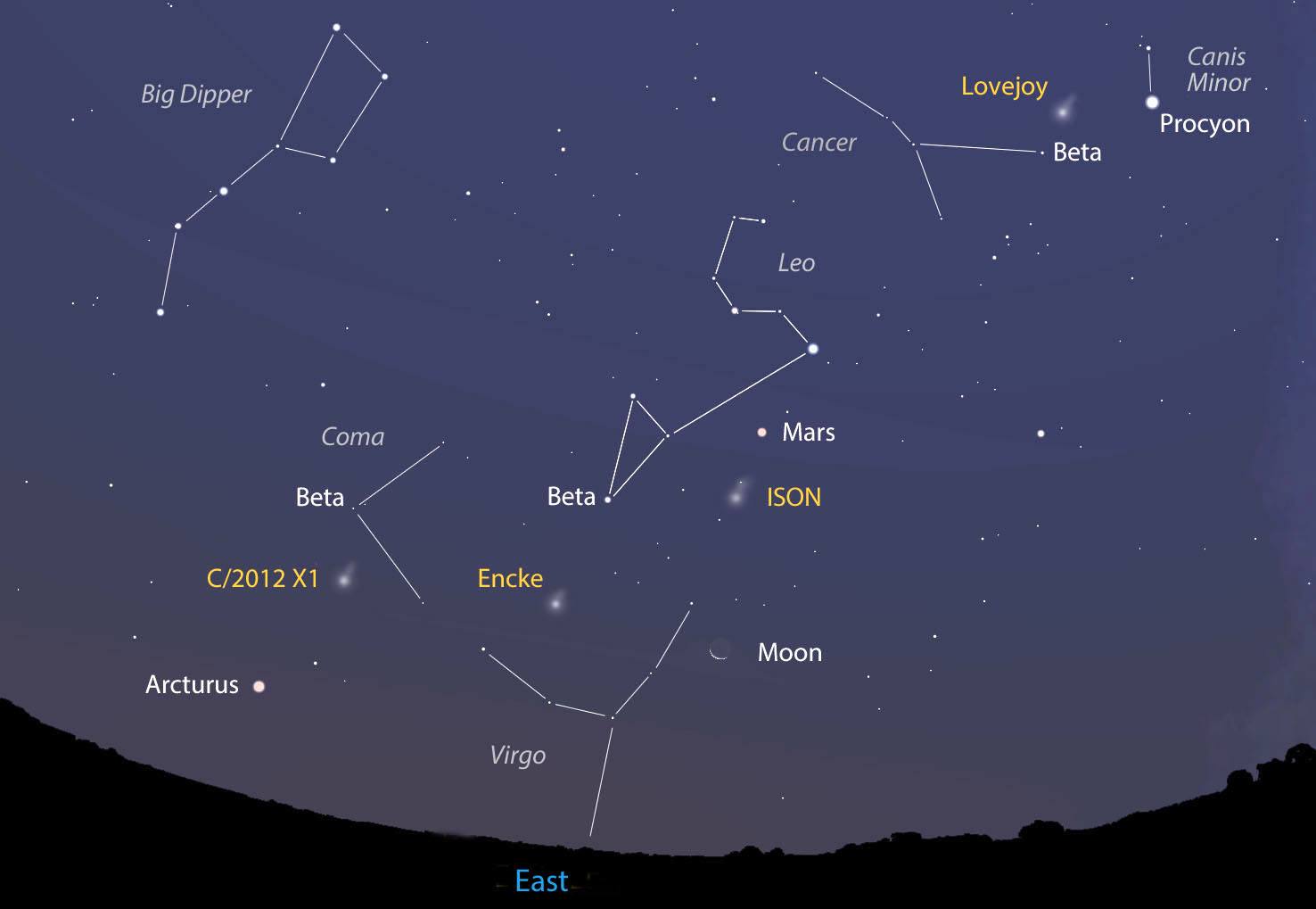 Cztery komety na listopadowym niebie - Janusz WilandListopad to czas, w którym możemy nad ranem obserwować aż cztery komety. Komety 2P/Encke, C/2013 R1 (Lovejoy) i C/2012 X1 (LINEAR) mają obecnie jasność około 8 magnitudo, a więc są kilka razy słabsze od najsłabszych gwiazd widocznych gołym okiem, ale wszystkie jaśnieją. Z obserwacjami 2P/Encke trzeba się spieszyć, bo ginie ona w blasku porannej łuny. Czwartą kometą jest zapowiadana na kometę stulecia C/2012 S1 (ISON). Na początku listopada jej jasność będzie wynosić około 9 magnitudo, ale w najbliższych tygodniach ma bardzo szybko wzrastać, dzięki czemu pod koniec miesiąca będzie można ją dojrzeć gołym okiem.