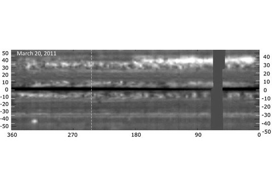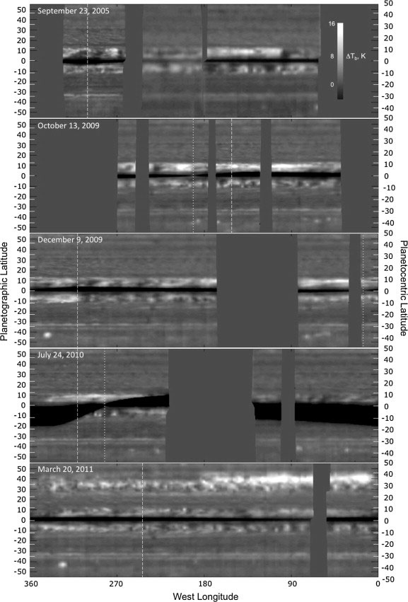 Porównanie turbulencji atmosfery Saturna w ostatnich latach / Credits - NASA, JPLOkreślono także globalny rozkład gazowego amoniaku. Zwykle występuje on w dużych ilościach. Jednak występują obszary, w których ilość amoniaku znacznie spada z powodu kondensacji do postaci ciekłej. Pod nimi znajdują się rejony większej niestabilności atmosfery. Miejsca te stanowią okna prezentujące głębsze, gorętsze części atmosfery. Utrata amoniaku jest wyraźnie widoczna w Alei Sztormów oraz w sztormie z 2011 r. Wykazuje to, że następuje ona głęboko w atmosferze, jeszcze pod szczytami chmur amoniakalnych.