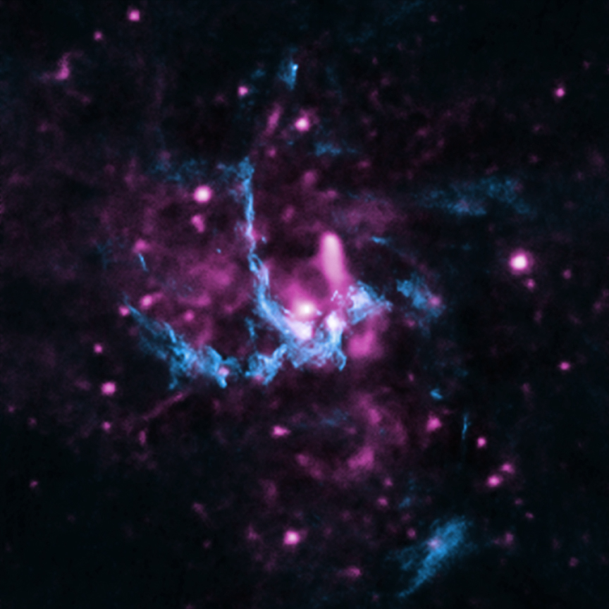 Wynik wspólnych obserwacji dżetu Sgr A* z Chandry i VLA / Credits: X-ray: NASA/CXC/UCLA/Z. Li et al; Radio: NRAO/VLADzięki obserwacjom kosmicznego teleskopu rentgenowskiego Chandra udało się potwierdzić istnienie dżetu wysokoenergetycznych cząstek od czarnej dziury Sgr A*, znajdującej się w centrum naszej Galaktyki. Dane zostały wzbogacone obserwacjami z radioteleskopu Very Large Array.