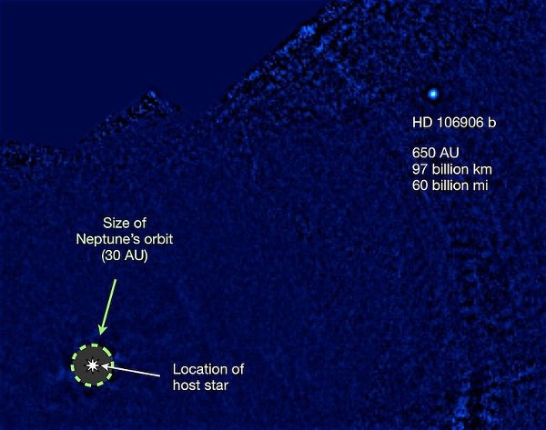HD 106906 b / Credits - Vanessa BaileyNiedawno doniesiono o istnieniu planety pozasłonecznej o oznaczeniu HD 106906 b. Jest to duży i młody gazowy gigant, krążący w rekordowej odległości 650 jednostek astronomicznych od swej gwiazdy macierzystej.