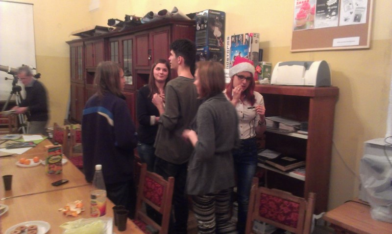 składanie życzeńGwiazda wigilijna zbliża się nieuchronnie a na saniach pędzą już prezenty pod nasze choinki. W tak miłej atmosferze miło jest się spotkać nie tylko by porozmawiać o gwiazdach ale i znaleźć czas na życzenia dla bliskich znajomych i przyjaciół. Tak było i tym razem w astronomicznym podziemnym zaciszu Pałacu Książęcego w Żaganiu. Najwięksi niespodziankę zrobiły nam nasze koleżanki. Niespodzianka przerosła nasze oczekiwania. Odwdzięczyliśmy się życzeniami tak szczerymi jak tylko byliśmy z siebie w stanie wykrzesać.
