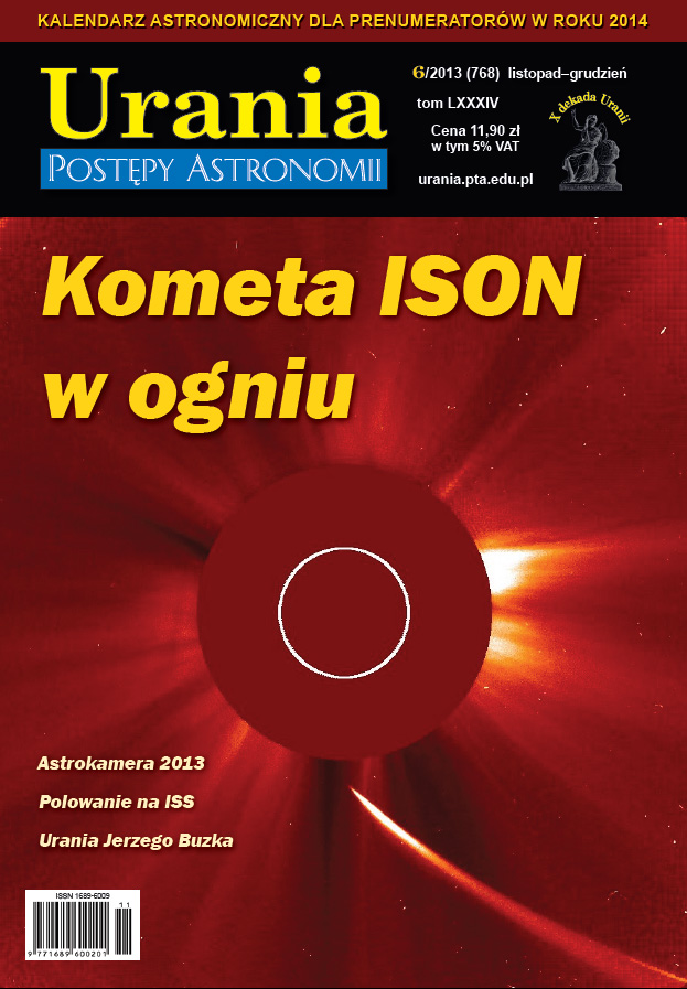Okładka 6 numeru Urania Postępy AstronomiiOczywiście numery ostatnie roku 2013 a nie ostatnie w ogóle. To na uciszenie skołatanych nerwów. No bo jak nie mieć ich w takim stanie skoro numer listopad-grudzień przychodzi na koniec grudnia. To jakby już tradycja. Ale w zamian dostajemy wspaniałą lekturę na najwyższym poziomie. Zarówno poprzedni (5) jak i ostatni (6) numer w dużej części poświęcony jest kometom, żeby nie powiedzieć komecie. Ale do rzeczy.