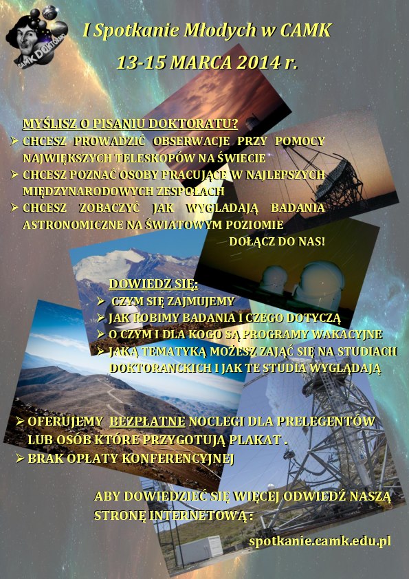 Młodzi astronomowie spotkanją się w CAMKStudenci myślący o karierze naukowej w astronomii mogą wziąć udział w I Spotkaniu Młodych, organizowanym przez doktorantów Centrum Astronomicznego im. Mikołaja Kopernika (CAMK) w Warszawie między 13 a 15 marca.