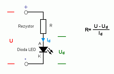 Schemat zasilania diody LED - półprzewodnikowej diody świecącej - na tej bazie obliczyliśmy oporność rezystora potrzebnego do zasilania diody z akumulatora 12VNa bazie prostego układu zasilania diody LED poznaliśmy w zasadzie wszystkie podstawy elektroniki. Oczywiście to gruba przesada. Nie wszystkie, ale na tyle dużo, by nie rozstawać się z nią (Elektronika Łatwa i Przyjemna) na dłużej niż trzeba. Bo ten świat jest zdominowany przez elektronikę i warto coś niecoś wiedzieć, a może nawet zafascynować się możliwościami na dłużej. Czasy są dzisiaj znacznie bardziej przyjazne niż kiedyś. Na początek mamy masę literatury i prasy z tego zakresu, a firmy dostarczające zestawów do samodzielnego montażu prześcigają się w ofertach. Zobaczymy jeszcze jak się sprawdzi Ośla Łączka, bo wiedza ta znacznie wykracza poza ramy szkoły do jakiej uczęszcza większość z nas. Ale u nas wszystko wykracza poza wszelkie ramy.