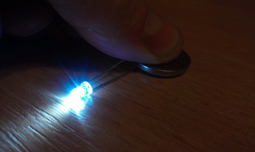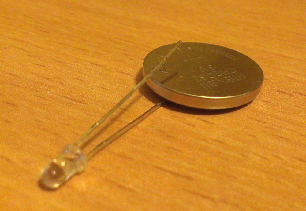 Zbuduj samodzielnie z diody i pastylkowej 3V baterii latarkę. Dlaczego w układzie nie jest potrzebny rezystor? Spróbuj to wyjaśnić w oparciu o posiadane informacje z zajęć i artykułów opisujących wcześniejsze spotkania.