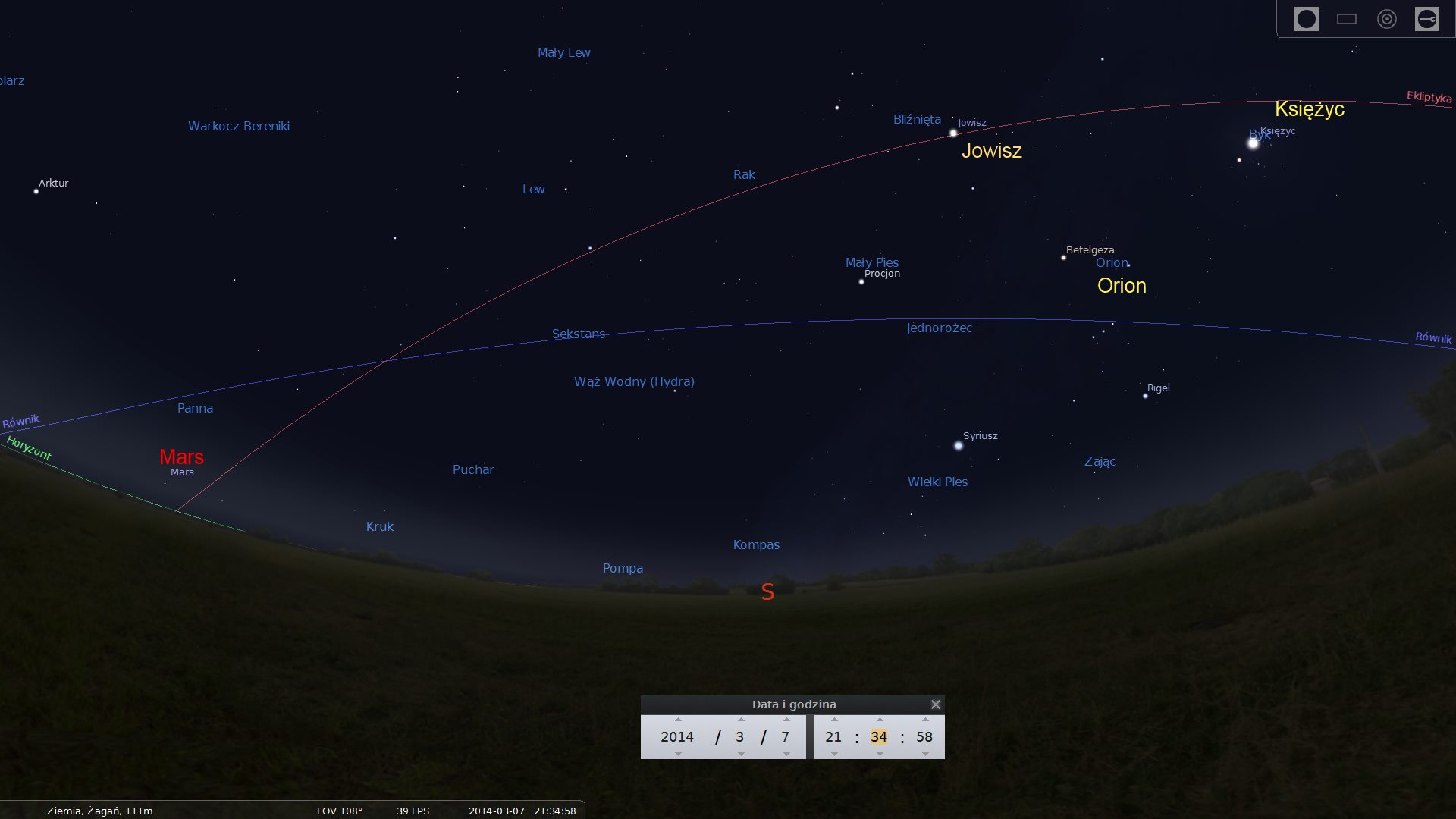 Mars widoczny przez większą część nocy w okolicach Panny. Jego rozmiar mniejszy od Jowisza, bo tylko 15’’, ale to początek najlepszych w roku warunków obserwacyjnych Czerwonej Planety. Obserwację szczegółów powierzchni oraz czap polarnych zapewnia średniej wielkości refraktor – około 90mm lub nieco większej średnicy reflektor – 130mm. A to z racji stosowania dużych powiększeń – około 150 razy. Aby nie utracić zbytnio na rozdzielczości potrzeba większego teleskopu. Mars bowiem jest mniejszy od Ziemi i z takiej odległości zawsze stanowił wielkie wyzwanie dla obserwatora. Nie doszukujmy się jednak na nim kanałów itp. To już przerobiliśmy za prawą włoskiego astronoma Giovanniego Schiaparellego. 18 marca dojdzie do ciekawego zbliżenia Księżyca, Marsa i najjaśniejszej gwiazdy Panny – Spicy.