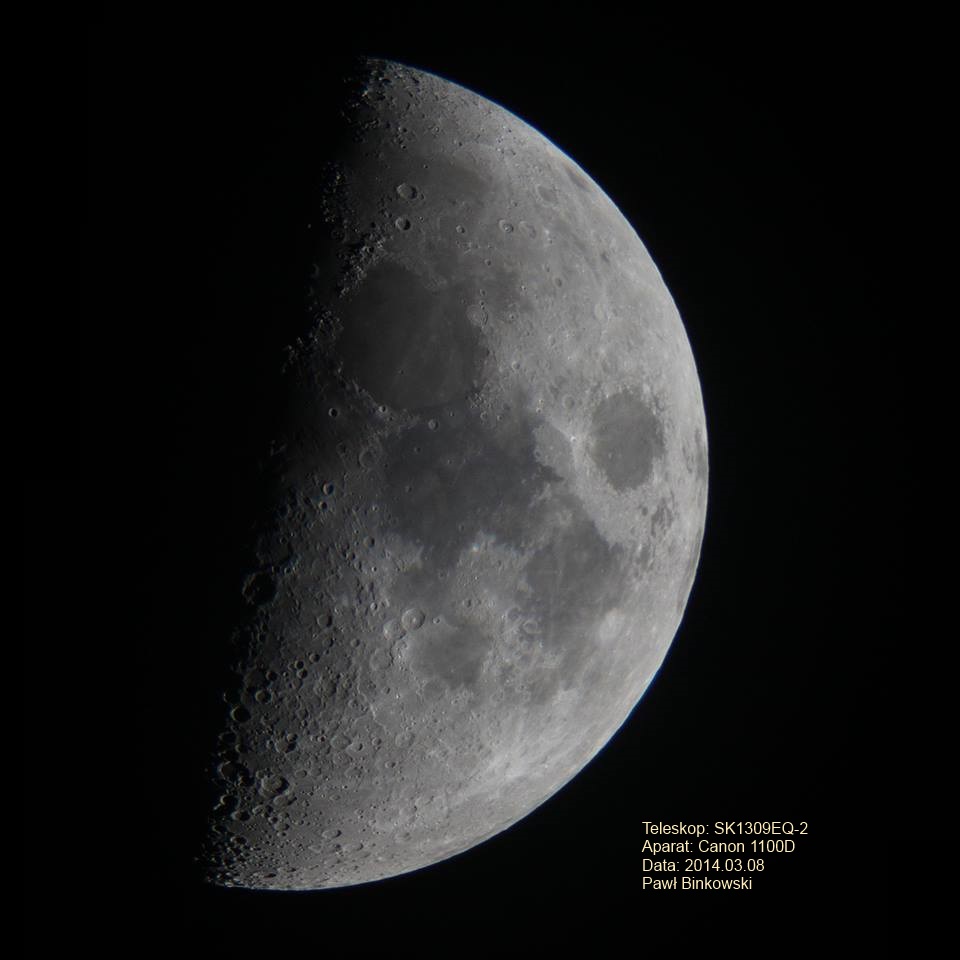 Jeden z naszych polskich kolegów wykonał w Dzień Kobiet te wspaniałe zdjęcie Księżyca w I kwadrze.Ciepły jak na tę porę roku sobotni dzień kończył się piękną pogodą. Gdy przybywaliśmy na zajęcia nad głowami witał nas Jowisz wraz Księżycem w pierwszej kwadrze. Na drodze stała tylko nam scena kolegów z sekcji instrumentalnej, którzy przed wejściem do Pałacu organizowali tym razem swoje występy. Z gustami muzycznymi się nie dyskutuje, ale nie jesteśmy przyzwyczajeni do takiej dawki decybeli, przy których własnych myśli nie słychać. Wolimy raczej ciszę co najwyżej wypełnioną głosami ptaków i widokiem nieba.