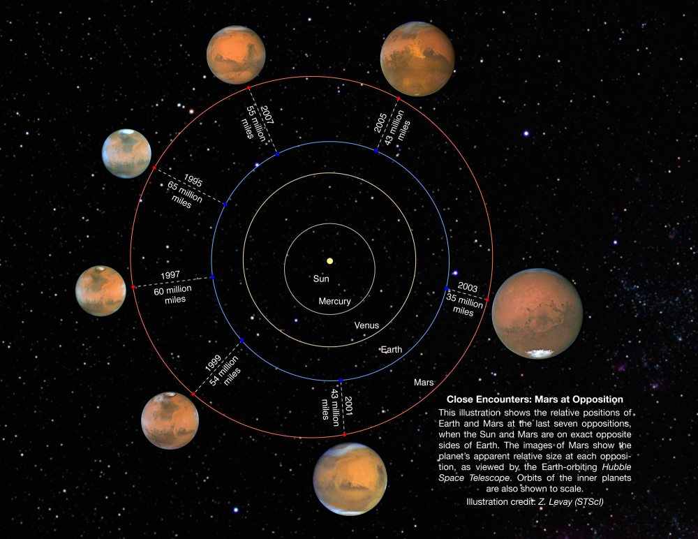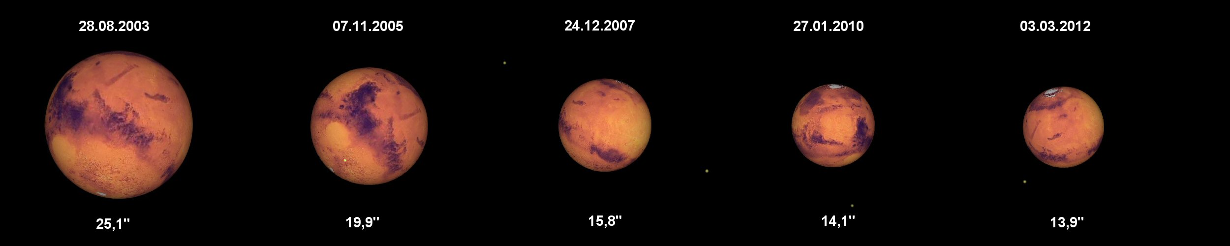 Porównanie rozmiarów MarsaMy do obserwacji Marsa wykorzystamy nasze amatorskie teleskopy. Dla nich czas opozycji to najlepszy czas na obserwacje i fotografowanie powierzchni planety. Warto jednak pamiętać, że choć opozycja nastąpi 8 kwietnia, to największego zbliżenia plant dojdzie w dniu 14 kwietnia. Opozycja to jedynie ustawienie się planet w jednej linii po tej samej stronie Słońca. Duży mimośród orbity Marsa powoduje, że w czasie takich spotkań dochodzi co 15 (średnio) lat do wielkich opozycji. W czasie takie zjawiska astronomicznego planety są niezwykle blisko siebie. Jutro Mars będzie w odległości