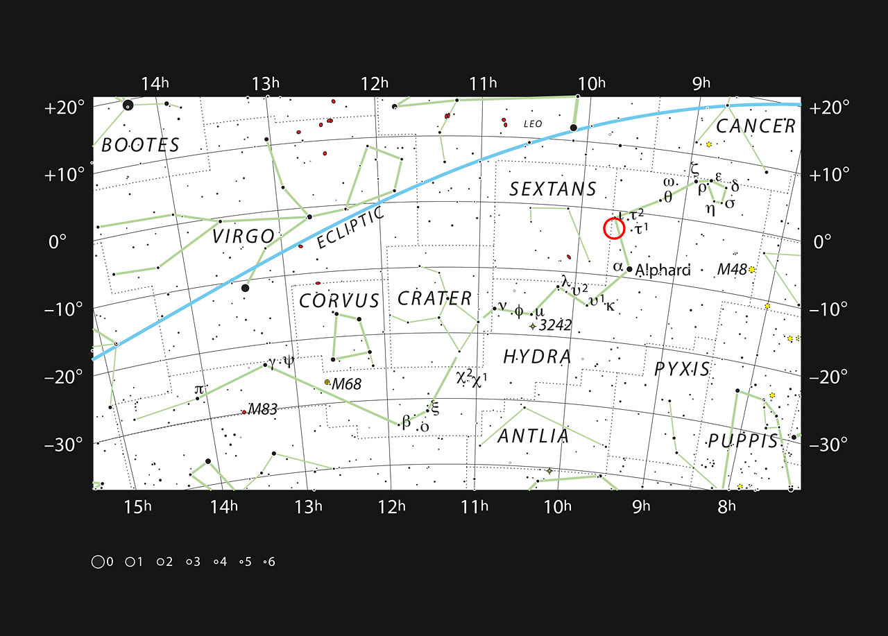 [2] Na tym bardzo ostrym zdjęciu centralna gwiazda wydaje się podwójna. Nie wiadomo czy to faktyczna podwójność, czy tylko przypadkowe ułożenie gwiazd.