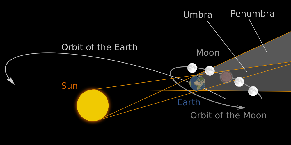 Strefa cienia (umbra) i półcienia (penumbra). W części środkowej cienia światło słoneczne nie dochodzi bezpośrednio ze Słońca. Natomiast w rejonie cienia jedynie część światła słonecznego jest zablokowana.Zaćmienie księżyca ma miejsce kiedy Księżyc wchodzi w cień rzucany przez Ziemię oświetlaną światłem słonecznym. Może to mieć miejsce kiedy to Słońce, Ziemia i Księżyc są ustawione są dokładnie, lub niemal dokładnie w jednej linii zaś Ziemia znajduje się pomiędzy Słońcem a Księżycem. Dlatego też zaćmienie księżyca może mieć miejsce tylko i wyłącznie podczas pełni księżyca. Zaćmienie księżyca widoczne w każdym miejscu na Ziemi, gdzie podczas zaćmienia Księżyc znajduje się ponad horyzontem. W odróżnieniu od zjawiska zaćmienia słońca, wyróżnione fazy zjawiska zaćmienia księżyca są takie same niezależnie od miejsca obserwacji.