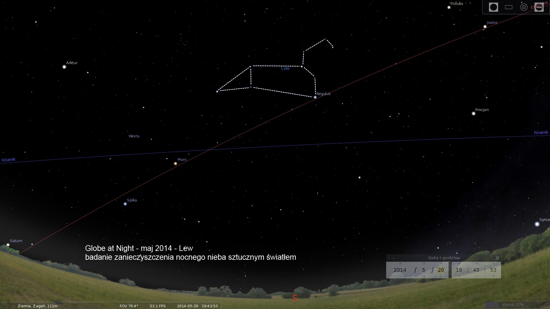 Globe at Nght. Projekt ten tym razem jest realizowany przez cały rok. Przypomnijmy tylko, że w ramach badania należy wyznaczyć zasięg gwiazdowy w oparciu o wskazany przez organizatorów projektu gwiazdozbiór. Dla nas tym razem będzie to Lew (do marca był to Orion). Jak należy ustalać zasięg gwiazdowy w oparciu o Lwa pokazano na stronie -