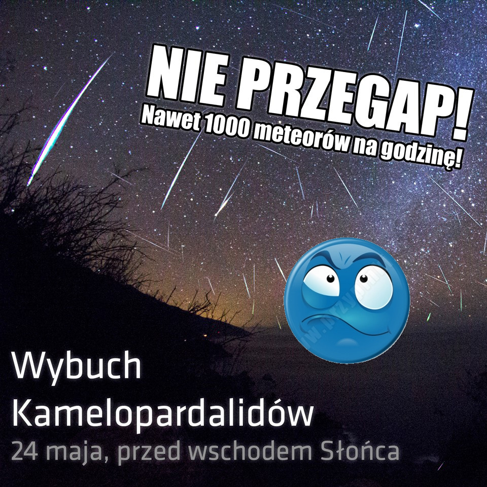 209P/LINEAR. Jego debiut na naszym niebie miał być wyjątkowo spektakularny, bo modele pokazywały, że 24 maja około godziny 8-10 naszego czasu, można się spodziewać nawet kilkuset meteorów na godzinę. Co więcej, spektakl miał był wyjątkowo efektowny, bo Camelopardalidy wchodzą w naszą atmosferę z prędkością 15 km/s, a więc jedną z najmniejszych pośród wszystkich rojów meteorów.