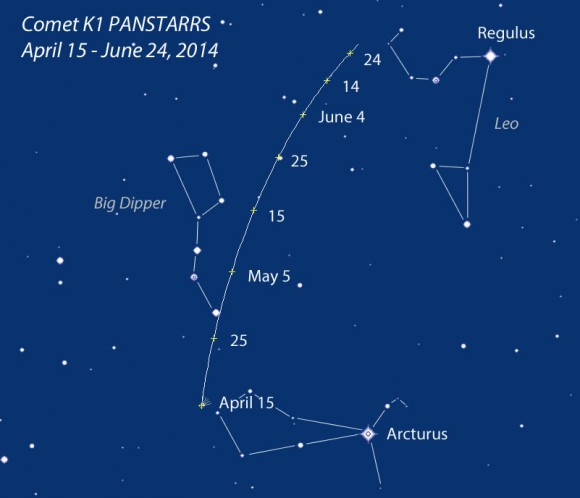 "Obecnie kometa świeci na tle gwiazd konstelacji Wielkiej Niedźwiedzicy, co stwarza wręcz doskonałe warunki do jej obserwacji. Około godziny 22, a więc w czasie gdy jest już ciemno, kometa świeci w Polsce prawie w zenicie. Co więcej, w obserwacjach coraz mniej przeszkadza Księżyc, który zbliża się do nowiu wypadającego 28 maja. Końcówka maja i początek czerwca, to świetny czas do wypatrywania C/2012 K1 (PanSTARRS)" - zaznaczył.