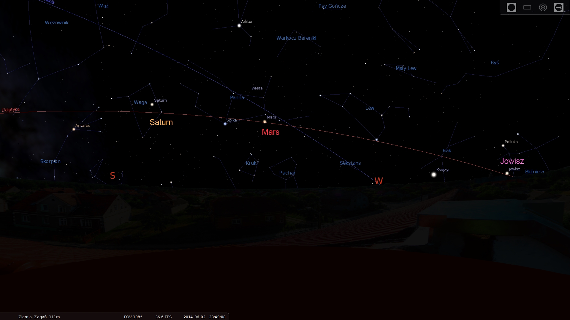 Mars, po opozycji, świeci na wieczornym niebie. Znajdziemy go w konstelacji Panny, niedaleko niebieskawej Spiki. Jego blask w czerwcu maleje od -0,5 do 0 magnitudo.
