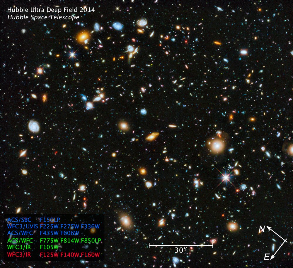 Ultrafioletowa część Ultra Głębokiego Pola Hubble’a. Kompozytowy obraz HUDF / Credits - NASA i ESAKosmiczny teleskop HST od lat obserwuje Ultra Głębokie Pole Hubble’a, w którym znajduje się około 10 tysięcy galaktyk, w tym i tych powstałych we wczesnym Wszechświecie. W nowej wersji zdjęcia tego obszaru dodano zakres ultrafioletowy.