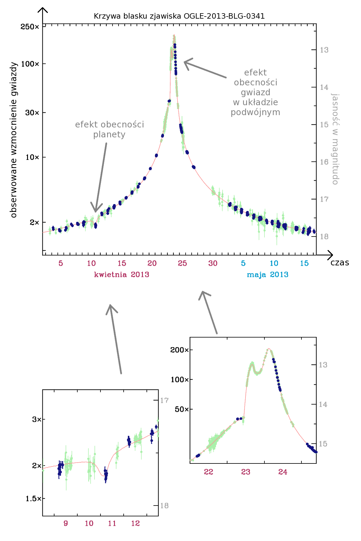 Przebieg zmian jasności w zjawisku mikrosoczewkowania grawitacyjnego OGLE-2013-BLG-0341 (niebieskie punkty oznaczają obserwacje wykonane przez projekt OGLE) Istotnie – krótkotrwały spadek jasności wywołany został przez obecność planety, a następnie jasność obserwowanego układu zaczęła szybko rosnąć, w miarę gdy gwiazda macierzysta coraz silniej uginała promienie świetlne. Jednak ku zaskoczeniu naukowców spodziewających się gładkiego maksimum blasku, typowego dla pojedynczej gwiazdy, niesymetryczne zmiany jasności szybko zdradziły obecność drugiej gwiazdy w układzie. Nie było więc wątpliwości, że OGLE-2013-BLG-0341LB to układ planetarny w układzie podwójnym gwiazd. Zwłaszcza, że w danych obserwacyjnych zebranych rok wcześniej – jeszcze przed głównym zjawiskiem – udało się odnaleźć niewielkie pojaśnienie wywołane mikrosoczewkowaniem przez dalszy składnik układu podwójnego, gdy ten znajdował się najbliżej linii widzenia.
