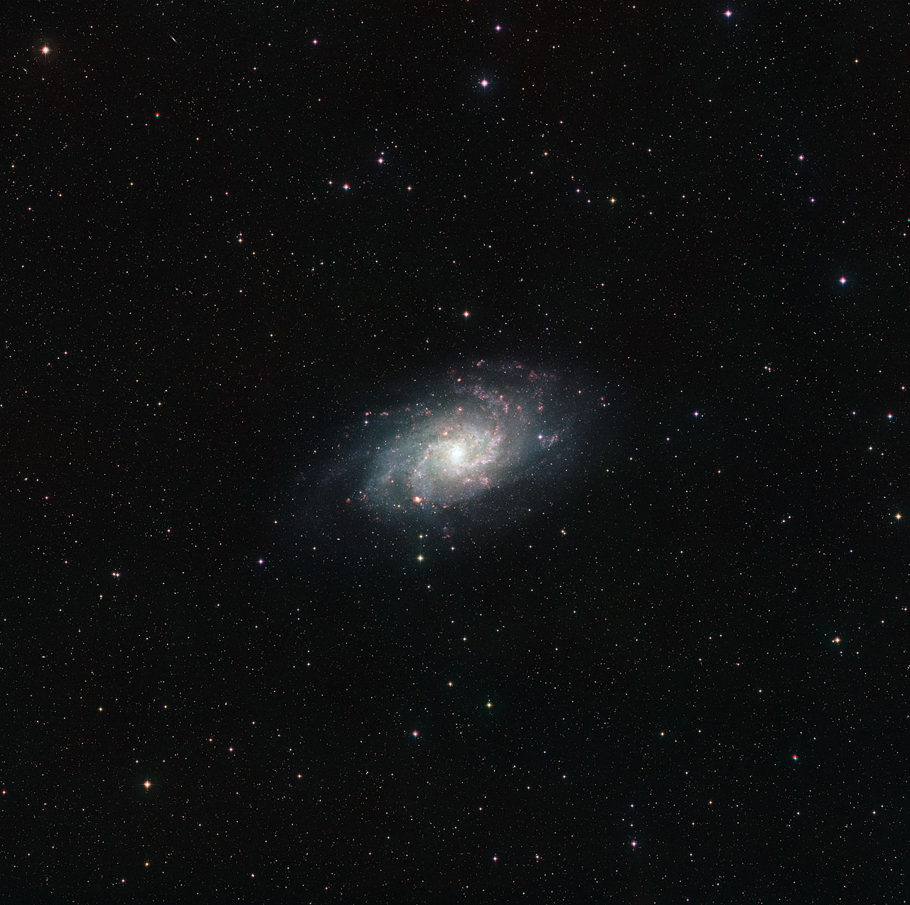 Mimo, że Galaktyka w Trójkącie znajduje się na niebie północnym, jest widoczna z Obserwatorium Paranal w Chile, chociaż nie wznosi się zbyt wysoko na niebie. Zdjęcie wykonano za pomocą VLT Survey Telescope (VST), najnowocześniejszego 2,6-metrowego teleskopu do przeglądów nieba o polu widzenia dwukrotnie większego niż tarcza Księżyca w pełni. Zdjęcie zostało złożone z wielu pojedynczych ekspozycji, w tym wykonanych przez filtr przepuszczający jedynie światło świecącego wodoru, które czyni czerwone obłoki gazu w ramionach spiralnych galaktyk szczególnie widocznymi.